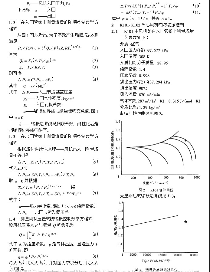 離心風(fēng)機(jī)的調(diào)節(jié)方法一是轉(zhuǎn)速調(diào)節(jié),二是管路調(diào)節(jié)。后者又分為入口調(diào)節(jié)、出口調(diào)節(jié)和回流調(diào)節(jié)。入口調(diào)節(jié)又有導(dǎo)葉或入口閥門調(diào)節(jié),此時(shí)必須注意吸入口流量不能低于氣體喘振臨界點(diǎn)的流量。出口管路調(diào)節(jié)對(duì)大風(fēng)機(jī)來說不易操作而且消耗太大。打回流的調(diào)節(jié)方法可有效防止喘振現(xiàn)象的發(fā)生。無(wú)論哪種調(diào)節(jié),由于受處理量波動(dòng)等影響,喘振時(shí)刻會(huì)發(fā)生。鎮(zhèn)海煉化公司煉油廠硫磺裝置大型化后,離心風(fēng)機(jī)的喘振時(shí)有發(fā)生,如主風(fēng)機(jī)1"%" 在運(yùn)行時(shí)和在線增壓機(jī) 1"%$ 在運(yùn)行、切換時(shí)均發(fā)生過喘振,影響了裝置的正常運(yùn)行。通過對(duì)離心風(fēng)機(jī)喘振特性的研究,以數(shù)學(xué)式的形式,給出風(fēng)機(jī)前、后孔板壓差以及風(fēng)機(jī)出入口壓差與出入口參數(shù)的關(guān)系式,并對(duì)主風(fēng)機(jī)和增壓機(jī)進(jìn)行了計(jì)算,以便在操作時(shí)作為喘振控制的依據(jù)。