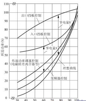 由電工原理可知電機(jī)的轉(zhuǎn)速與電源頻率成正比,通過變頻器可任意改變電源輸出頻率從而任意調(diào)節(jié)電機(jī)轉(zhuǎn)速,實(shí)現(xiàn)平滑的無級調(diào)速。離心式風(fēng)機(jī)在變速調(diào)節(jié)的 過程中,如果不考慮管道系統(tǒng)阻力R的影響,風(fēng)機(jī)的*大特點(diǎn)是負(fù)載轉(zhuǎn)矩與轉(zhuǎn)速的平方成正比,而軸功率與轉(zhuǎn)速的立方成正比。因此,將電機(jī)定速運(yùn)轉(zhuǎn)改變?yōu)楦鶕?jù)流 量需要使用相應(yīng)電源頻率來調(diào)節(jié)電機(jī)變速運(yùn)轉(zhuǎn),就可節(jié)約大量電能, 也能夠產(chǎn)生巨大的經(jīng)濟(jì)效益。由圖1可看出變頻器控制是*接近理想曲線的。