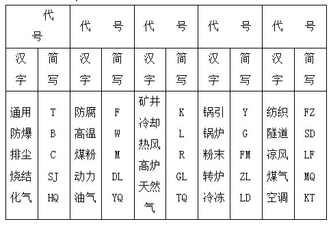 常用風(fēng)機(jī)用途代號(hào)