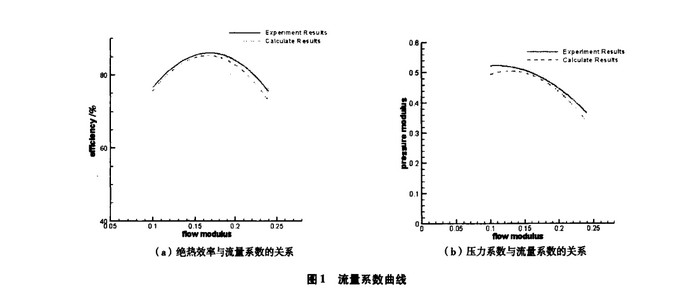 圖 1給出了試驗 和計 算的 絕熱效 率和 壓力系 數(shù)隨 流量