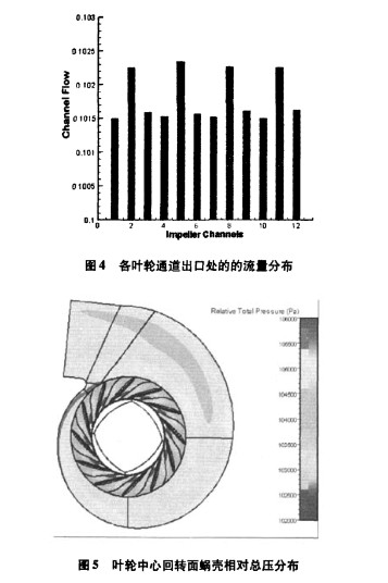 通道 (見圖 2)的 流量分 布圖, 由該 圖可 明顯 看出, 對于 帶蝸殼的離心風機 由于蝸殼的影響, 各個葉 輪通道出口 流量相差很大, 如果用單一通 道模式 來計 算, 很難準 確把 握這 種非對稱 性。圖 5是 *大效 率工況 下的葉 輪中心回 轉面蝸 殼相對總壓分布圖, 由圖可 以明顯 看出, 在 蝸殼內(nèi) 部遠 離蝸 殼出口葉輪產(chǎn)生的壓 比較大, 而在靠近蝸殼出 口附近葉輪 產(chǎn)生的壓