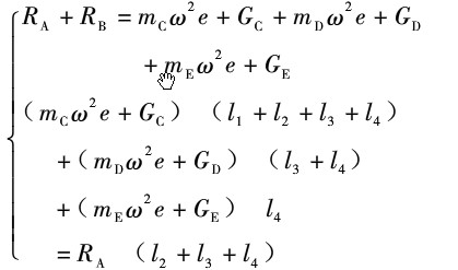 在制造與安裝風機葉片與軸時, 質(zhì)心與軸線 間存在一定的偏移量, 通常要求動平衡試驗精度 達到 6. 3級, 最大偏心距允許 010406 mm。按偏 心距和額定轉(zhuǎn)速計算不平衡載荷( 離心力, 式( 1) 中的 mX2e 項) 。根據(jù)作用在平衡物體上力的總 和為零, 力矩總和為零, 建立方程組: