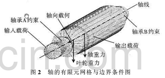 圖 2 軸的有限元網(wǎng)格與邊界條件圖 風機軸的材料為 45 號鋼, 其彈性常數(shù)為 2. 1 @1011 N/ m2, 泊松比 0. 3, 密度 7 800 kg/ m3。 2. 2. 1 靜力學分析 如圖 2 所示, 對風機軸模型施加約束與作用 力, 進行靜力學分析。根據(jù)電機功率與轉(zhuǎn)速, 計算 出輸入轉(zhuǎn)矩為 5 160 N#m。將輸入轉(zhuǎn)矩轉(zhuǎn)化為作 用在聯(lián)軸器處的切向載荷, 施加在軸外表面 24@ 8個節(jié)點上, 每個節(jié)點上作用力的為 448. 00 N。 輸出轉(zhuǎn)矩轉(zhuǎn)化為作用在葉輪處的切向載荷, 施加 在軸外表面 24@ 1 個節(jié)點上, 每個節(jié)點的切向力 為1 869. 93 N。同時將軸向力、聯(lián)軸器、軸與葉輪 的重力分別施加在各幾何中心的節(jié)點上。 模型的靜力學分析, 得到通過軸心剖面上的