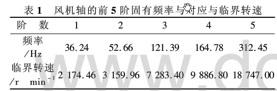 2. 2. 2 動力學分析( 模態(tài)分析) 工作時, 風機軸不僅承受軸、葉輪等的自重, 還承受輸入轉(zhuǎn)矩、軸向沖擊等動態(tài)載荷。當轉(zhuǎn)速 達到軸的固有臨界轉(zhuǎn)速時, 軸的撓度達到最大值, 處于/ 臨界0狀態(tài), 將產(chǎn)生劇烈的振動, 導致軸壽命 下降, 因此, 對風機軸進行模態(tài)分析是有必要的。 建立風機模態(tài)分析模型時, 在軸承的兩端施加徑 向約束, 并在軸承 A 處施加軸向約束, 同時將葉 輪看作集中質(zhì)量作用在其幾何中心處。風機軸的 模態(tài)分析求得前 5階固有頻率, 如表 1 所列。