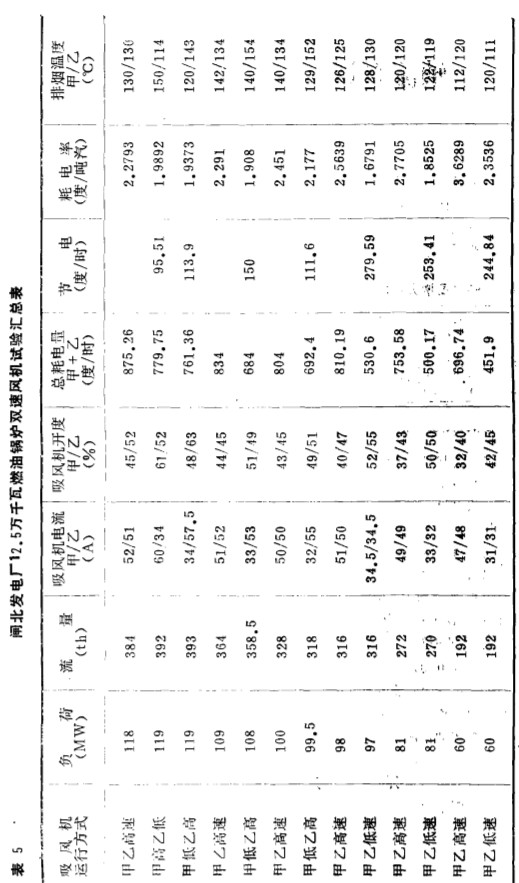 雙速 電動機傳動實際上是定級 調(diào)速 , 必須和風 機入 口導向擋板配合使用 。在規(guī)定的兩檔轉 速條件下, 當導 向擋板全開 時, 離心風機效果最好 。 當導向擋板關小時 , 非但存在著節(jié)流損失, 而且風 機的效率也會下降 。 但由于有兩檔轉速 可以調(diào)節(jié) , 風機 在整 個負荷范圍內(nèi)的效率是 有 所改善的。 因此, 雙 速電動機 傳動 比恒速電動機 傳動能獲得較好的經(jīng) 濟效益 。 上 海閘北 發(fā)電廠先后在 81 年 7 月 和 82 年 7 月將本廠一 臺12 . 5萬千 瓦機組 ( # 15 爐 ) 的 兩臺吸風 機的電動機改為雙速 電動機 ( 730 j560 轉/ 分 ) 。 在滿負荷時兩臺吸風 機都放在高速 檔運行 ; 在低負荷時, 兩 臺吸風 機都放在低速檔運行 。 表 5 為 82 年 10 月和 83 年 11 月熱態(tài) 實測主要數(shù)據(jù)匯總表。