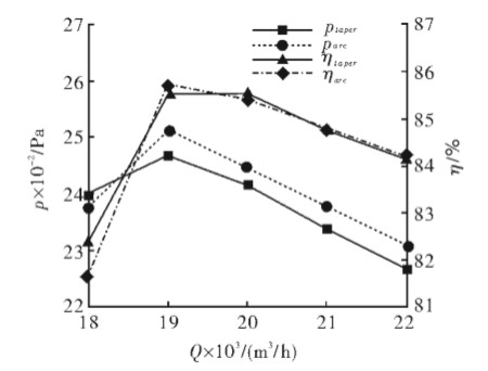 在圖 2 中, parc 和 ηarc 分別表示最優(yōu)弧前盤的 全壓和效率, ptaper 和 ηtaper 分別表示錐前盤雛形的 全壓和效率。由圖 2 可知,在全壓方面,兩者的 最大全壓值均出現(xiàn)在流量為 19000m3/h 時(shí),此時(shí) 最優(yōu)弧前盤全壓為 2512.6Pa,錐前盤雛形為 2470.1Pa, 前 者 比 后 者 高 1.72% 。 小 流 量 18000m3/h 時(shí),前者比后者低 0.66%,而大流量 20000m3/h 、21000m3/h 和 22000m3/h 時(shí)前者比后 者分別高 1.44%、1.71%和 2.02%;在效率方面,兩 者的最大效率值均在流量為 19000m3/h 時(shí),此時(shí) 最優(yōu)弧前盤效率為 85.71%,錐前盤雛形為 85.55% , 前 者 比 后 者 高 0.16% 。 當(dāng) 流 量 為18000m3/h 時(shí),前者比后者低 0.80%,其它流量處 兩者效率差不多。 為了比較兩種形狀葉輪前盤均在最優(yōu)情況 下的性能,所以對錐前盤雛形也進(jìn)行了優(yōu)化,見 圖 3。