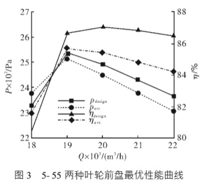 原 5- 55 設(shè)計(jì)參數(shù):流量為 20000m3/h;全壓 為 2500Pa;轉(zhuǎn)速為 1450r/min;工作溫度為 20℃; 弧前盤;葉片數(shù)為 16;等當(dāng)量擴(kuò)張角型線。 2.2 5- 55 弧前盤與錐前盤風(fēng)機(jī)性能對比 對 5- 55 風(fēng)機(jī)葉輪前盤按照弧前盤進(jìn)行建模 計(jì)算,并且對其進(jìn)行優(yōu)化,在最優(yōu)參數(shù)的基礎(chǔ) 上,得到弧前盤在不同工況下的性能曲線。再按 照進(jìn)風(fēng)口準(zhǔn)則,將風(fēng)機(jī)前盤由弧前盤改為錐前 盤進(jìn)行建模計(jì)算,得到同樣參數(shù)下錐前盤的雛 形(此時(shí)錐前盤尚未優(yōu)化)在不同工況下的性能 曲線,優(yōu)化后的弧前盤與錐前盤雛形的性能曲 線見圖 2。