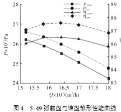3.25-49 弧前盤與錐前盤風(fēng)機(jī)性能對比 對風(fēng)機(jī) 5- 49 按照同樣的方法得到弧前盤與 錐前盤雛形在不同工況下的性能曲線,見圖 4。