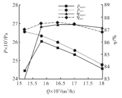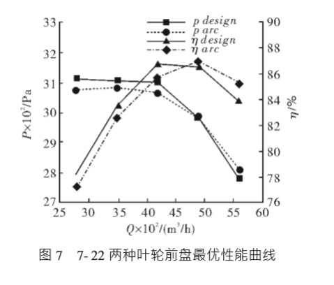 對于 7- 22 風(fēng)機(jī),從整體看兩者效率和全壓 性能均好,最高效率值均接近 87%,但對應(yīng)的流 量點(diǎn)位置不同,小流量時(shí)錐前盤的全壓和效率 均稍高于弧前盤,但大流量時(shí),則剛好相反,兩 者全壓和效率的差別均在 1%左右。