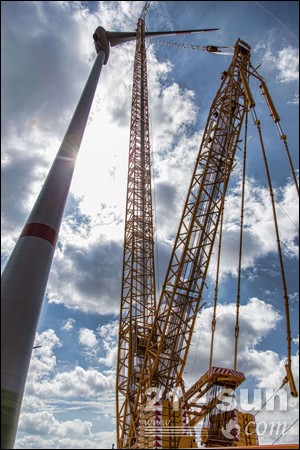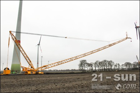 2013年10月,德國 Scharell——位于德國 Saterland’s Ostermoor bog 的 Scharrel 社區(qū)風電場正在興建中,工作重點是架設(shè)大型風機,以便產(chǎn)生“綠色”電能。Franz Bracht Kranvermietung 是專門從事重型吊裝業(yè)務的公司,此次承接了在風電場安裝 Enercon E-101 風機的任務。這些風機是 E-101 系列風機中型號最大的,輪轂高度達 149 米。安裝這些龐然大物,起重機服務供應商依靠的是新型 Terex Superlift 3800 桁架臂履帶式起重機。該起重機能力超群,開發(fā)之初設(shè)計者正是考慮到了此類應用場合的需求。