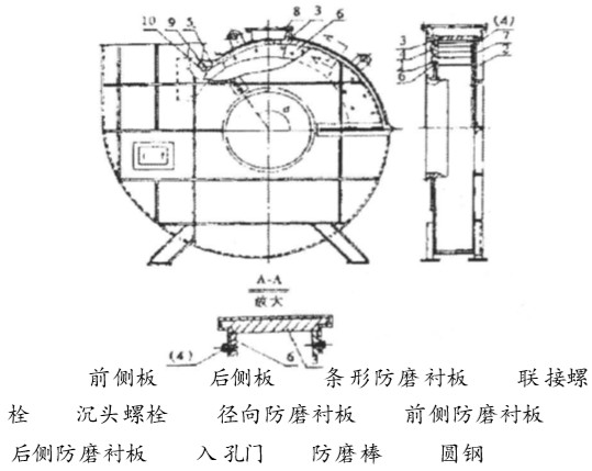 3. 1 傳統(tǒng)檢修方法 風(fēng)殼磨損即產(chǎn)生泄漏, 必須及時(shí)進(jìn)行修復(fù), 常 采用外部貼補(bǔ)和堆焊的臨時(shí)辦法進(jìn)行處理。但磨 損嚴(yán)重, 則要將風(fēng)機(jī)解體后進(jìn)行修復(fù)。把被損壞 的殼體進(jìn)行堆焊或挖補(bǔ)復(fù)原, 再將磨損的徑向防 磨襯板用氧、乙炔焰自殼體上切割下來(lái), 按原樣裝 上新的防磨襯板。但這種方法, 極易造成風(fēng)殼變 形, 導(dǎo)致密封不嚴(yán)。 3. 2 風(fēng)殼內(nèi)敷設(shè)耐磨襯板 為解決風(fēng)殼的磨損問(wèn)題, 提出了在風(fēng)殼內(nèi)敷 設(shè)耐磨襯板的方法, 即在風(fēng)殼內(nèi)敷設(shè)耐磨合金襯 板[2] , 敷設(shè)前要將原來(lái)的徑向弧形襯板從殼體上 切割下來(lái), 再將鑄造的耐磨合金襯板一件一件地 用銷(xiāo)釘與殼體固定[3] , 采用這種方法在施工中發(fā) 現(xiàn)如下問(wèn)題: