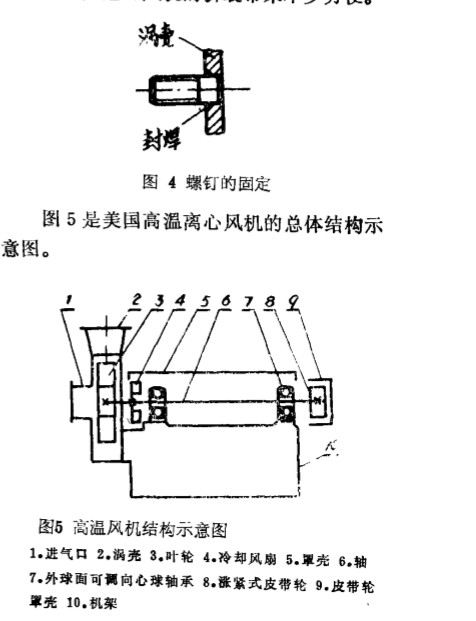 5.從三角皮帶輪,這是利用皮帶輪的錐孔與開 口 的錐形套筒間的配合, 當(dāng)用螺 栓拉緊皮帶輪使其沿錐套表面 有微小 的位移 時(shí) , 強(qiáng)迫錐形套筒內(nèi)孔收縮, 這就產(chǎn)生了對 軸的夾緊力而固定在軸上的。 其詳細(xì)結(jié)構(gòu) 已 在拙作 《一種裝拆快速 、 方便的 皮 帶 輪 結(jié) 構(gòu)》 ( 《化工裝備技術(shù)》 1 986 N O 9 期) 一 文中 已有說明此處從略。 6 。 聯(lián)接螺釘?shù)墓潭?, 離心 風(fēng)機(jī)渦 殼 前 后要 分別同機(jī)架與風(fēng)機(jī)進(jìn)氣室 (蓋) 聯(lián)接, 其聯(lián)接螺釘 (不銹鋼 制) 是插入風(fēng) 機(jī) 渦 殼 (己之 4 ) 上事先鉆好的通孔 中再予 以封 焊 固 定的 (圖 4 ) 。 因此禍 殼的 流道 內(nèi) 壁 平 整, 而且 由于定位精度 較高業(yè)能與渦殼基本 保持垂直 , 這對風(fēng)機(jī)的拆裝帶來不少方便。