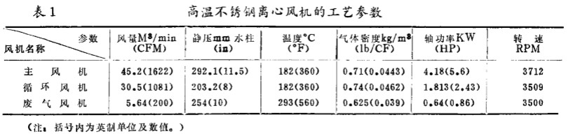 1 9 8 0 年 從 美 國Sfo r k 一 B o w e n 公司 引進(jìn)的 整套干燥 裝置中有三 臺高溫不銹 鋼離心風(fēng)機(jī) , 它們在 工 藝 條件下 的性能參數(shù)綜合為 表 1 。