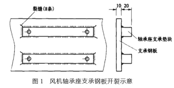 1 立窯鼓風(fēng)用離心式通風(fēng)機(jī) 該風(fēng)機(jī)型號 SNY10-1, 流量 13240~14800m3/h, 全壓 26540~26960Pa, 轉(zhuǎn)速 2980r/min, 拖動電動機(jī) Y315L1-2,160kW。 2004 年 8 月底, 發(fā)現(xiàn)軸承座處支承鋼板有明顯 開裂, 開裂位置見圖 1。風(fēng)機(jī)整體震動較大, 靠近葉輪 端軸承處裂縫較長, 震動亦稍大。開裂處多次焊接, 并 且裂縫逐漸加長。