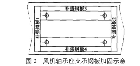 原因分析: 風(fēng)機(jī)正常運轉(zhuǎn)時產(chǎn)生的允許震動使支 承鋼板產(chǎn)生了疲勞裂縫, 而裂縫經(jīng)單面焊接不能恢 復(fù)其固有的剛度, 并因震動加劇而擴(kuò)張。裂縫的擴(kuò)張延伸使支承架剛度減弱, 這就讓轉(zhuǎn)子的動不平衡度加 強(qiáng), 從而引起了劇烈的共振。 消除方法: 補(bǔ)焊 4 塊鋼板增大支承架剛度, 如圖 2 所示。