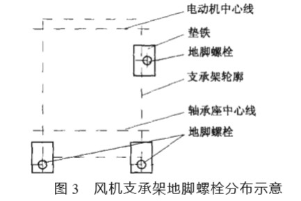 1)地基不牢固。由于支承架地腳螺栓只有 3 個, 且分布不合理, 如圖 3 所示。后來澆注的水泥地基亦 不堅固, 與原樓面未凝結(jié)成整體, 且較薄。