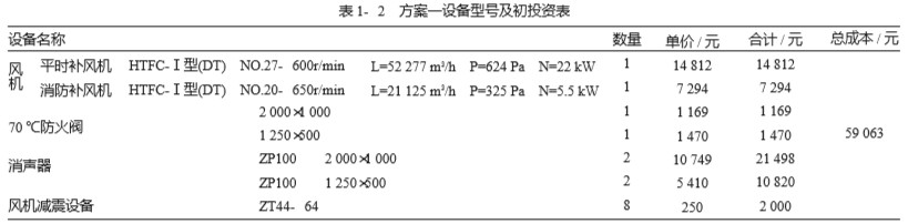 方案二:采用單臺(tái) HTFC 雙速風(fēng)機(jī),高速運(yùn)行時(shí)作平時(shí)補(bǔ)風(fēng)用,低速運(yùn)行時(shí)作消防補(bǔ)風(fēng)用。設(shè)備型號(hào) 及初投資見表 1- 3。