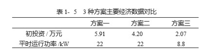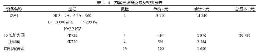 方案三:采用 4 臺(tái)同型號(hào)混流風(fēng)機(jī)并聯(lián)使用,平 時(shí)補(bǔ)風(fēng)時(shí) 4 臺(tái)風(fēng)機(jī)全部啟動(dòng),消防補(bǔ)風(fēng)時(shí)開啟其中 2臺(tái),設(shè)備型號(hào)及初投資見表 1- 4。 3.1.3 3 種方案主要經(jīng)濟(jì)數(shù)據(jù)比較