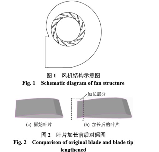 1 數(shù)值模擬 1.1 計算模型的建立 以 G4–73№.8 離心風(fēng)機為研究對象,該風(fēng)機的 結(jié)構(gòu)如圖 1 所示。本文采用的葉片加長方式為在流 道型線不變、進(jìn)口各幾何尺寸不變的情況下,沿每 個葉片工作面的出口邊切線方向,焊接一定長度的單板葉片,并保證接口處平滑過渡,如圖2所示。同時將葉輪的后盤與前盤沿圓周方向各焊接上一個圓環(huán),使其直接和加長葉片后的葉輪外徑齊平。