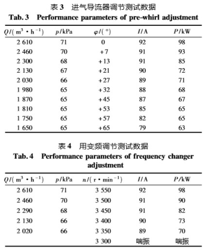 從表 3, 4 對比可看出,進(jìn)氣預(yù)旋調(diào)節(jié)法能擴(kuò)大 風(fēng)機(jī)的使用范圍和提高風(fēng)機(jī)調(diào)節(jié)性能. 而且,進(jìn)氣預(yù) 旋調(diào)節(jié)法使離心風(fēng)機(jī)具有高效、寬工況運(yùn)行范圍、無 級微調(diào)的特點(diǎn). 流量調(diào)節(jié)到 60%時,效率下降平緩, 基本保持原有水平.