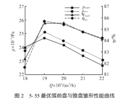由于前盤形狀改變,相應(yīng)的錐前盤葉輪的葉 片型線,也要按弧前盤葉輪生成等當(dāng)量擴張角 的葉片型線。這樣得到的錐前盤葉輪和原弧前 盤葉輪的其它葉輪參數(shù),如進出口直徑、進出口 寬度和進出口角均相同,具有可比性。 2 5-55- 8 風(fēng)機性能數(shù)值預(yù)估對比 2.1 5- 55 基本設(shè)計參數(shù) 原 5- 55 設(shè)計參數(shù):流量為 20000m3/h;全壓 為 2500Pa;轉(zhuǎn)速為 1450r/min;工作溫度為 20℃; 弧前盤;葉片數(shù)為 16;等當(dāng)量擴張角型線。 2.2 5- 55 弧前盤與錐前盤風(fēng)機性能對比 對 5- 55 風(fēng)機葉輪前盤按照弧前盤進行建模 計算,并且對其進行優(yōu)化,在最優(yōu)參數(shù)的基礎(chǔ) 上,得到弧前盤在不同工況下的性能曲線。再按 照進風(fēng)口準(zhǔn)則,將風(fēng)機前盤由弧前盤改為錐前 盤進行建模計算,得到同樣參數(shù)下錐前盤的雛 形(此時錐前盤尚未優(yōu)化)在不同工況下的性能 曲線,優(yōu)化后的弧前盤與錐前盤雛形的性能曲 線見圖 2。