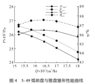 3.2 5-49 弧前盤與錐前盤風(fēng)機性能對比 對風(fēng)機 5- 49 按照同樣的方法得到弧前盤與 錐前盤雛形在不同工況下的性能曲線,見圖 4。