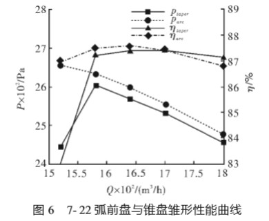 由圖 4 可知,在全壓方面,兩者的最大全壓 值均出現(xiàn)在流量為 15200m3/h 時,此時最優(yōu)弧前 盤全壓為 2659Pa,錐前盤雛形為 2619.2Pa,前者 比后者高 1.52%。隨著流量增大,兩者的全壓均 逐漸下降,但弧前盤全壓均比錐前盤雛形高,最 大為 2.22%,最小為 1.67%;在效率方面,兩者的 最大效率值均出現(xiàn)在流量為 16400m3/h 時,此時 最優(yōu)弧前盤效率為 87.56%,錐前盤雛形為 86.49%,前者比后者高 1.07%,從整體看,弧前盤 均比錐前盤效率高,最大為 1.10%,最小為 0.99%,兩者全壓和效率的變化趨勢一致。 同樣對錐前盤雛形也進行了優(yōu)化,圖 5 為兩 者均在最優(yōu)參數(shù)下的工況性能曲線比較。 由圖 5 可知,優(yōu)化后的錐前盤在大流量時, 全壓和效率方面均有所提升,效率比較接近,但 全壓還是不及弧前盤。錐前盤的最大全壓在設(shè) 計流量 15800m3/h 時,此時全壓為 2604Pa,比弧 前盤同流量時的全壓 2634Pa 低 1.15%。小流量 時,其全壓比弧前盤低 8.71%,而大流量時也均 比弧前盤低,最大為 1.06%,最小為 0.81%。在效 率方面,錐前盤的最大效率值出現(xiàn)在流量為 17000m3/h 時,此時效率為 87.42%,比同流量時 弧前盤的效率高 0.03%。小流量時,弧前盤效率 比錐前盤高 3.97%,但此時為小流量,計算不夠 穩(wěn)定,存在讀數(shù)誤差,而在大流量時,后者效率 有明顯的提高,并且在流量為 18000m3/h 處,后 者比前者高 0.30%。 對于 5- 49 風(fēng)機,從整體看兩者效率性能比 較接近,設(shè)計效率都很高,變工況性能也好,但全壓性能弧前盤比錐前盤普遍高 1%左右。