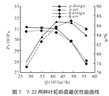 對于 7- 22 風(fēng)機,從整體看兩者效率和全壓 性能均好,最高效率值均接近 87%,但對應(yīng)的流 量點位置不同,小流量時錐前盤的全壓和效率 均稍高于弧前盤,但大流量時,則剛好相反,兩 者全壓和效率的差別均在 1%左右。