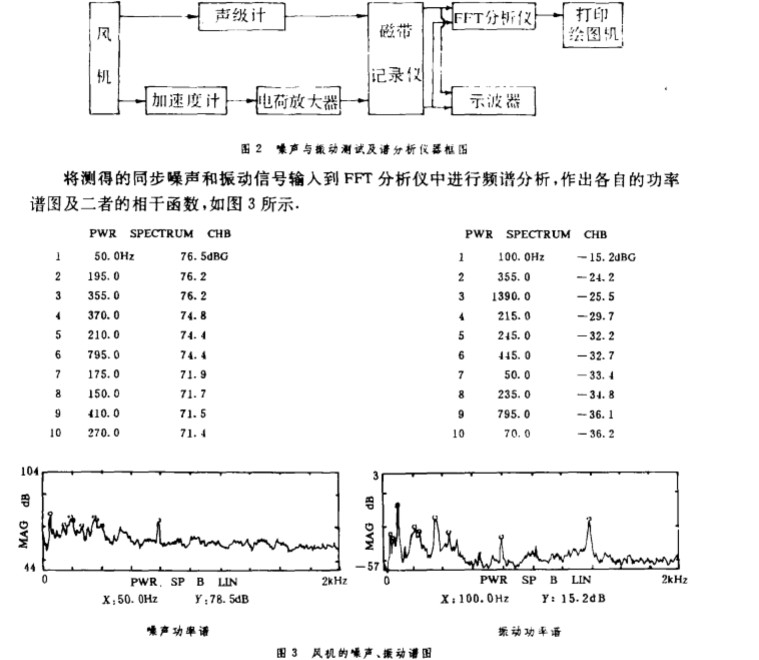 在測(cè)試噪聲信號(hào)的 同時(shí) , 又在機(jī)殼表面選一 點(diǎn)拾取 振動(dòng) 信號(hào) , 因 為在風(fēng)機(jī) 的兩個(gè)部件 中 , 機(jī) 殼振動(dòng)最 顯 著. 這樣經(jīng) 過(guò)譜分析后 , 可以看出振動(dòng) 對(duì) 噪聲影響大 小. 圖 2 是噪 聲與振動(dòng)測(cè) 試及譜分析儀器框圖.