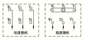 圖1 單速風(fēng)機(jī)Y與△接法 圖2 雙速風(fēng)機(jī)接線圖